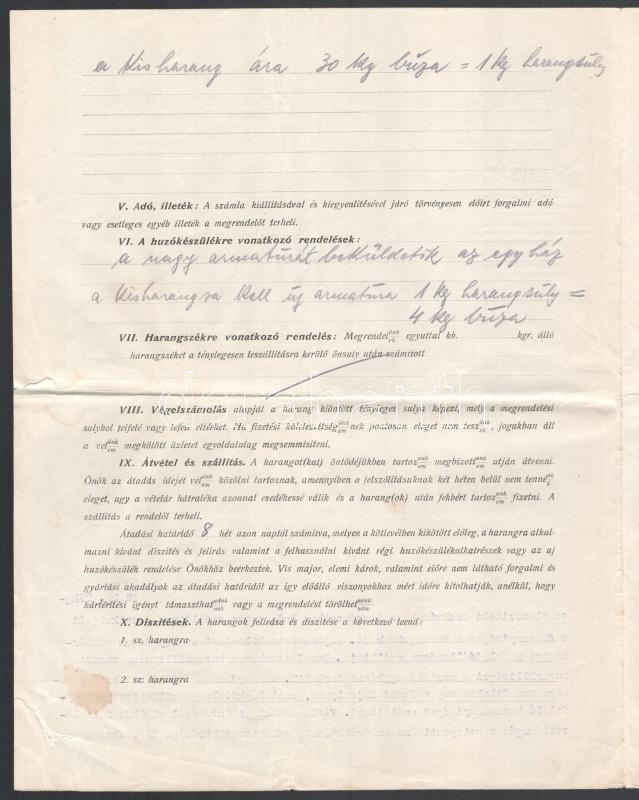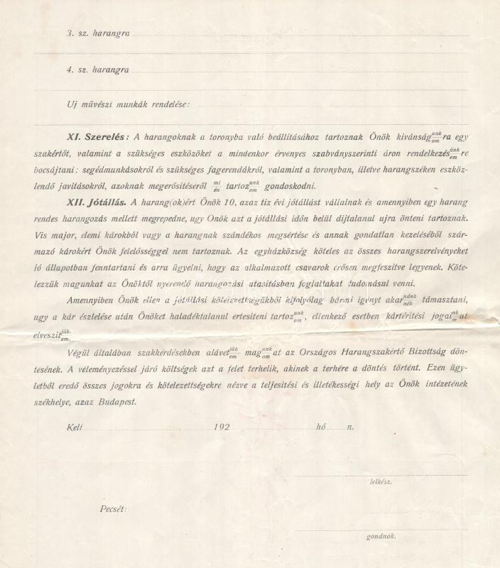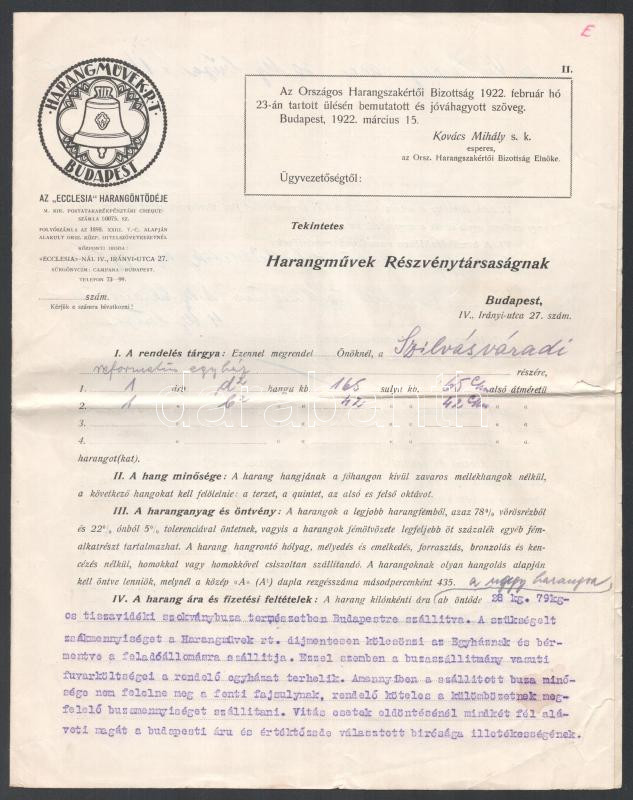 1922 A Harangművek rt. által készített szilvásváradi harang megrendelé...