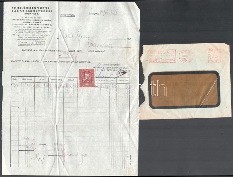1930 Bp., Hutter József Szappangyár-Olajipar R.T. fejléces számla, 2f okmánybélyeggel, eredeti borítékkal