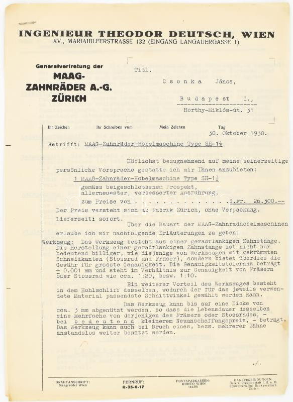 Description: 1930 Csonka János Gépgyár részére szóló gépelt prospektus, Ing. Theodor Deutsch bécsi mérnöktől, a MAAG - Zahnräder A-G, Zürich képviseletétől, 3 sztl. lev.