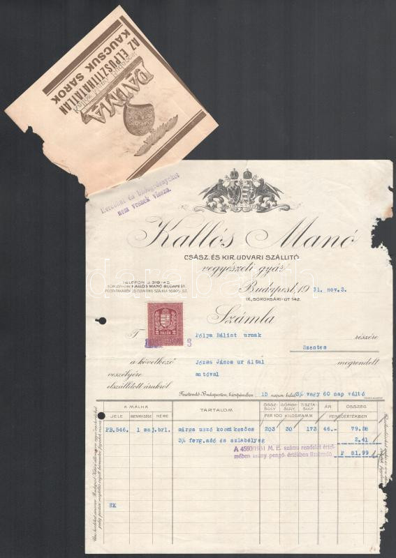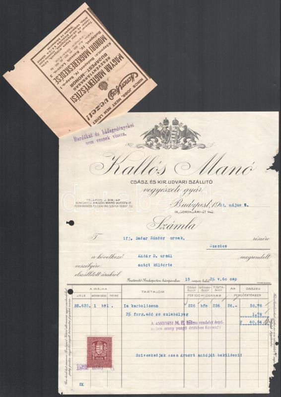https://www.darabanth.com/en/472-Online-auction/472.0/Art-and-other-collectibles/Advertisement~500001/1931-1932-Kallos-Mano-vegyeszeti-gyar-2-darab-fejleces-szamlaja-hiannyal-csatolmannyal~II3201725