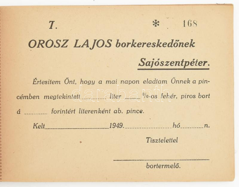 1949 Sajószentpéter Orosz Lajos borkereskedő vételi jegy tömbje 50 dup...