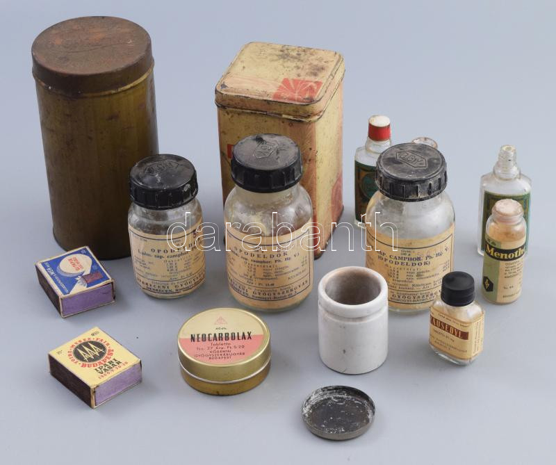 Doboznyi antik fémdoboz és patikai üveg, közte porcelán tégely, Ovomal...