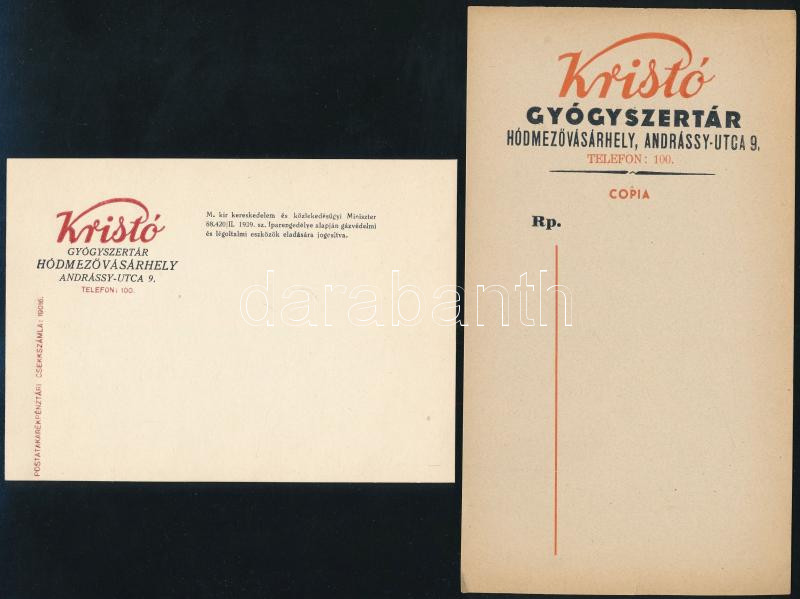 Kristó Gyógyszertár Hódmezővásárhely reklámkártya és recept, 2 db