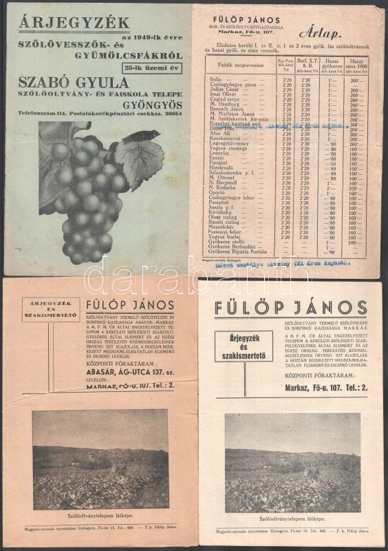 cca 1930-1940 Fülöp János, markazi bor- és szőlőoltvány termelő 4 db árlapja és árjegyzéke, megrendelő lappal;