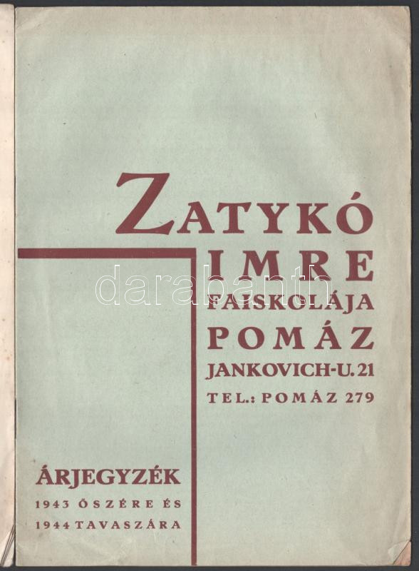 cca 1943-1944 Zatykó Imre pomázi faiskolájának 2 db árjegyzéke, az egyiken az elülső borító hiányzik.;
