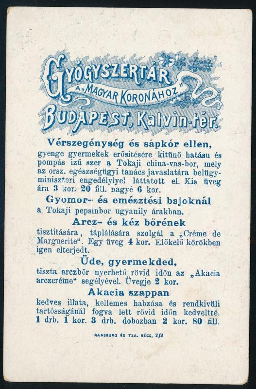 cca 1910 Bp., Kálvin tér, Gyógyszertár a ,,Magyar Koronához" reklámlap színes litho illusztrációval, 13x8,5 cm