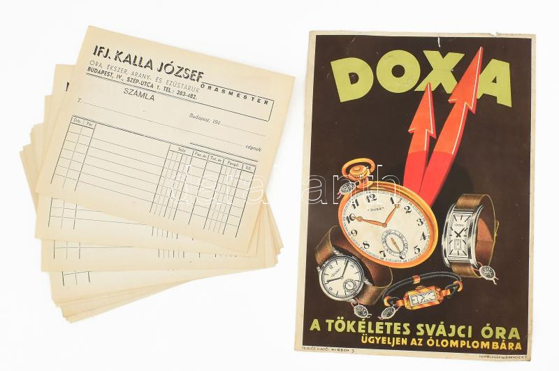 Description: cca 1930-1940 Doxa. A tökéletes svájci óra plakát 24x17 cm, kis szakadással + cca 1940 Ifj. Kalla József órásmester 10 darab fejléces kitöltetlen számla.