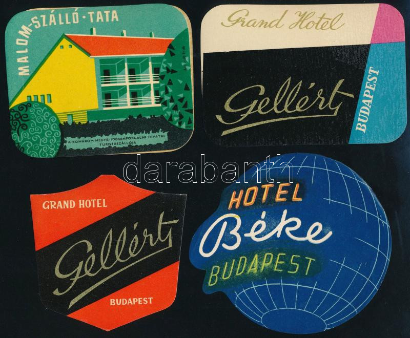 cca 1950 4 db magyar hotelcímke, bőröndcímke: Gellért, Béke, Tata Malo...