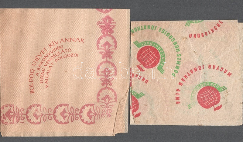Description: cca 1960-1970. 4 db retró reklámos szalvéta: 50 éves a nőmozgalom / 10 éves a "Röltex Rózsi" -- MOKÉP őszi filmújdonságok -- Hungarofruct, Magyar Jonathán alma -- Boldog Újévet kívánnak a Bakonyvidéki Üzemi Vendéglátó Vállalat dolgozói