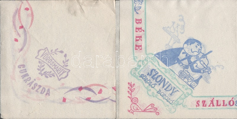 Description: cca 1960-1970. 4 db vendéglátó reklámos szalvéta: Vörösmarty Cukrászda, Budapest (3 különböző) -- Béke Szálló: Cukrászda / Szondy söröző-borozó / Kupolaterem / Étterem, Budapest