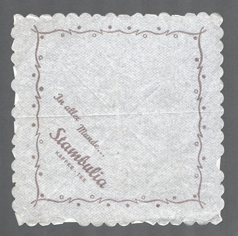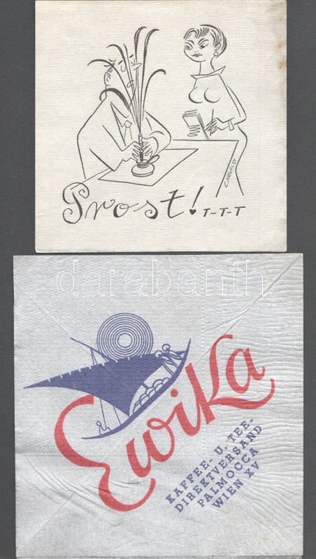 cca 1960-1970. 6 db német nyelvű vendéglátó reklámos szalvéta: Ewika K... https://www.darabanth.com/en/472-Online-auction/472.0/Art-and-other-collectibles/Advertisement~500001/cca-1960-1970-6-db-nemet-nyelvu-vendeglato-reklamos-szalveta-Ewika-Kaffee-u-Tee-Direktve~II3201644