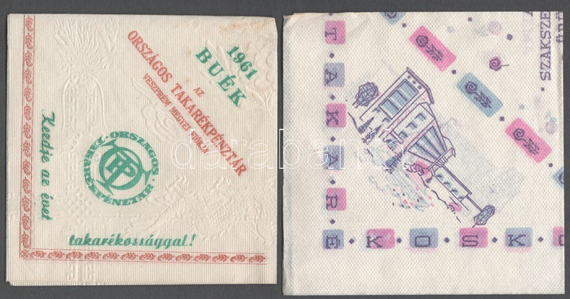cca 1960. 5 db retró reklámos szalvéta: Takarékbetétkönyv: "A szakszervezeti üdülés a jó munka jutalma" -- 1961 BUÉK, az Országos Takarékpénztár Veszprém megyei fiókja -- ÁB: "Nyugodtan üdülhet, ha van általános háztartási biztosítása!" (2 különböző) -- "Takarékoskodj! Gyűjts takarékbélyeget és valóra válnak vágyaid!" (Pedagógusok és Tanulók takarékpénztára)