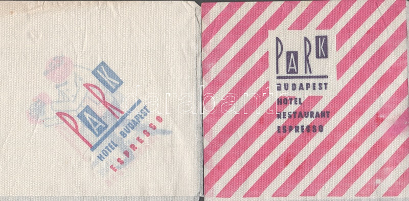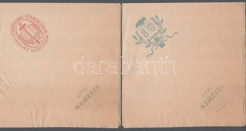 Description: cca 1960. 5 db vendéglátó reklámos szalvéta: Hotel Nemzeti, Budapest: "A 80 éves középfokú iparoktatás kiállítása" (2 különböző) -- Hotel Nemzeti, Budapest -- Park Hotel, Budapest (2 különböző)