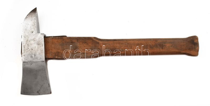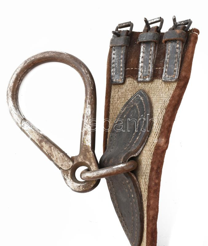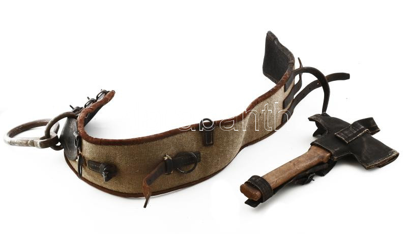 Description: Az 1873-ban alakult MÁVAG Önkéntes Tűzoltóság (Budapest, Golgota utca 6.) által rendszeresített tűzoltó mászóöv. Az övméret 3 db. bőrcsattal állítható. Az öv 115 cm hosszú, 12 cm széles, tartozéka a 11 cm átmérőjű karabiner. A 34 cm hosszú nyeles, vágó-és szúró fejű bontó balta vászon tokban az övhöz csatlakozik. / Vintage firemen belt and axe