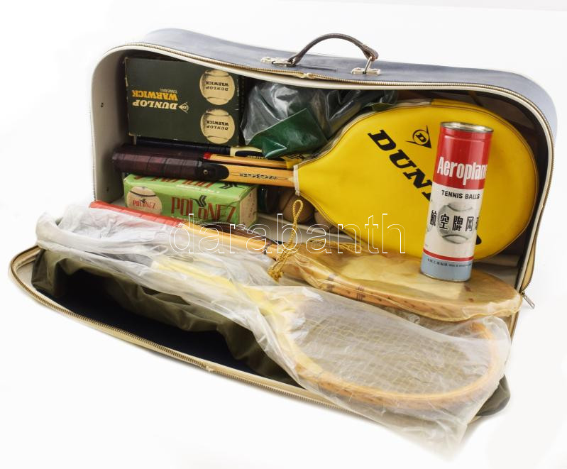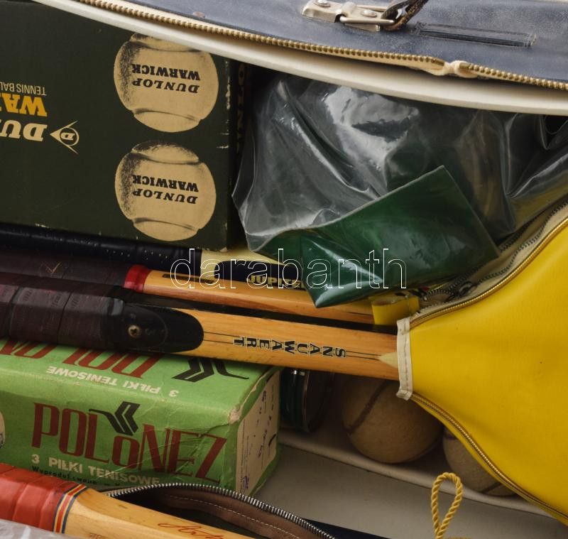 Régi nívós teniszező készlet, régi sporteszközökkel. Jupiter Slazenger teniszütő, Mustang Snauwaert teniszütő, Maxply Dunlop teniszütő, Artis Elastic húrozatlan teniszütő eredeti bontatlan húrral, Glassfibre Slazenger teniszütő, Dunlop Warwick labda szett, Polonez, Dunlop labda szettek, tenisztáskában, 75x35 cm