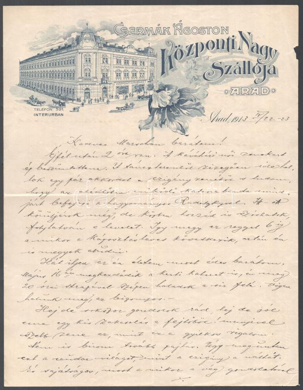 1913 Arad, Csermák Ágoston Központi Nagy Szállója fejléces levélpapírjára írt levél