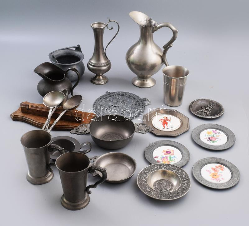 Nagy vegyes ón tárgy tétel: tálkák, kiöntők, kancsók, porcelán betétes tálkák, fali díszek 20 cm magasságig 20 db