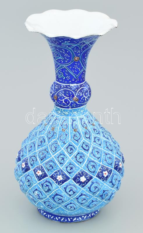 Zománcozott fém váza, kis sérülésekkel, m: 16 cm