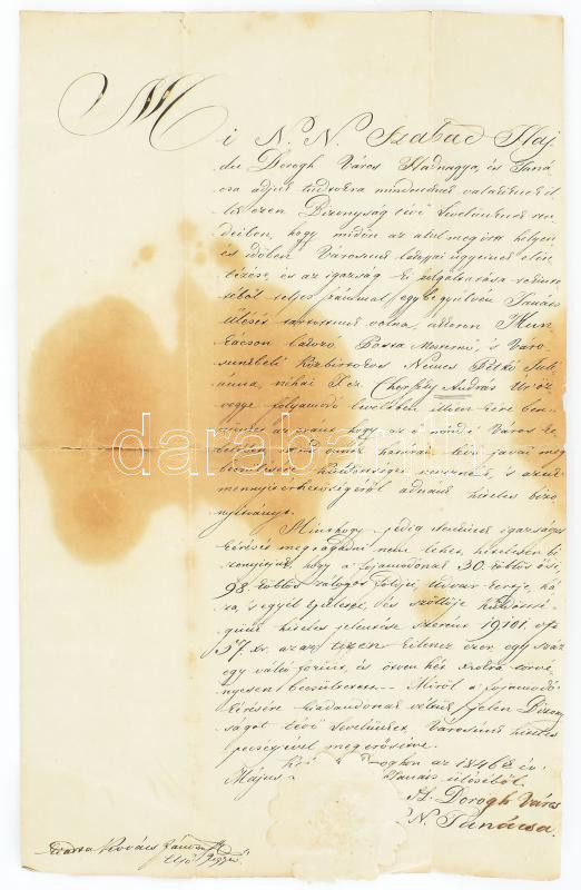 1846 Dorog város tanácsa által kiadott bizonyítvány nemes Petkó Julianna közbirtokos ingatlan javainak értékbecsléséről, egy beírt oldal, papírfelzetes viaszpecséttel. Kissé szakadt, foltos, 40x25 cm