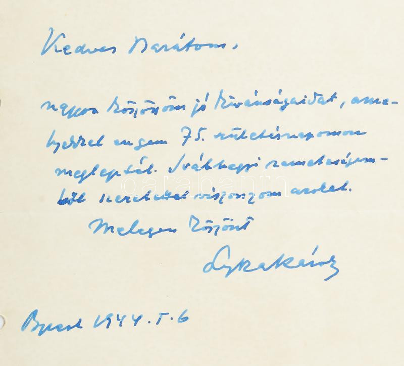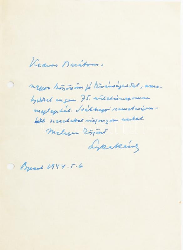 1944 Lyka Károly (1869-1965) művészettörténész, kritikus, festőművész, Művészet folyóirat egykori főszerkesztőjének (1902-1918) autográf köszönő levele születésnapi jókívánságokra válaszul, ifj. Bókay János (1892-1961) író, műfordító részére, 1944. I. 6. A szélén két lyukkal.