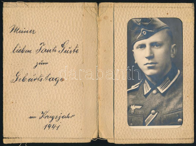 1941 Vaskereszttel kitüntetett német Wehrmacht katonatiszt portréja, Franciaországban (R. Delaunay, Saint-Brieuc) készült fotólap, eredeti papírtokban, autográf ajándékozási sorokkal. A tok kissé viseltes, sérült, a fotó jó állapotban, 13,5x8,5 cm