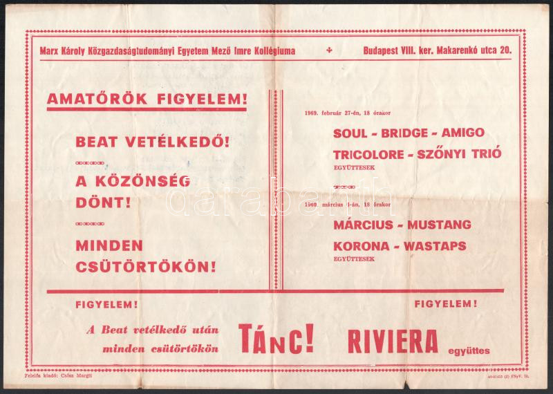 1969 Bp., Marx Károly Közgazdaságtudományi Egyetem Mező Imre Kollégium... https://www.darabanth.com/en/472-Online-auction/472.0/Art-and-other-collectibles/Posters~500014/1969-Bp-Marx-Karoly-Kozgazdasagtudomanyi-Egyetem-Mezo-Imre-Kollegiuma-Beat-vetelkedo-plak~II3153784