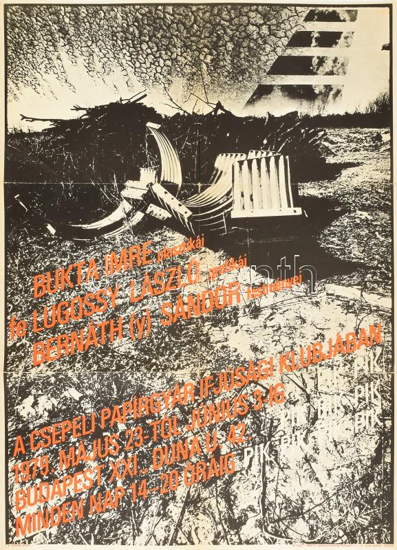 1979 Bukta Imre, fe Lugossy László és Bernáth (y) Sándor festményei a Csepeli Papírgyár Ifjúsági Klubjában, plakát, hajtott, 66×47 cm