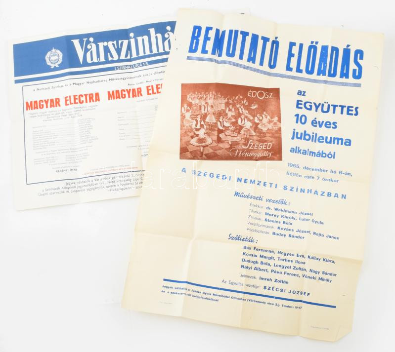 2 db szÃnházi plakát: VárszÃnház 1984. március havi műsora, hajtva, jó állapotban, 41,5x58 cm + 1965 ÉDOSZ Szeged Népiegyüttes, bemutató elÅ‘adás az együttes 10 éves jubileuma alkalmából a Szegedi Nemzeti SzÃnházban, hajtva, kisebb sérülésekkel, 70x49 cm