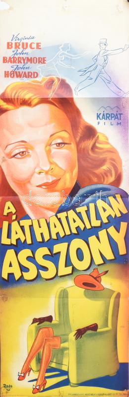 A láthatatlan asszony (The Invisible Woman), 1941. Moziplakát (filmplakát, rácsplakát). John Barrymore, John Howard, Virginia Bruce szereplésével. Litográfia, papír. jelzés nélkül. Radó Nyomda, Bp. Kárpát Film. Hajtásnyomokkal, lap bal felső sarkában grafikát nem érintő valamint apró rajzszögek által okozott sérülésekkel. Kissé foltos. 95×30,5 cm. Szürrealista grafika a korai science-fiction vígjátékhoz. Ritka, tudomásunk szerint korábban nem szerepelt árverésen! / Vintage rare Hungarian poster of the Hollywood movie "The Invisible Woman" from 1940, lithograph on paper, slightly damaged.