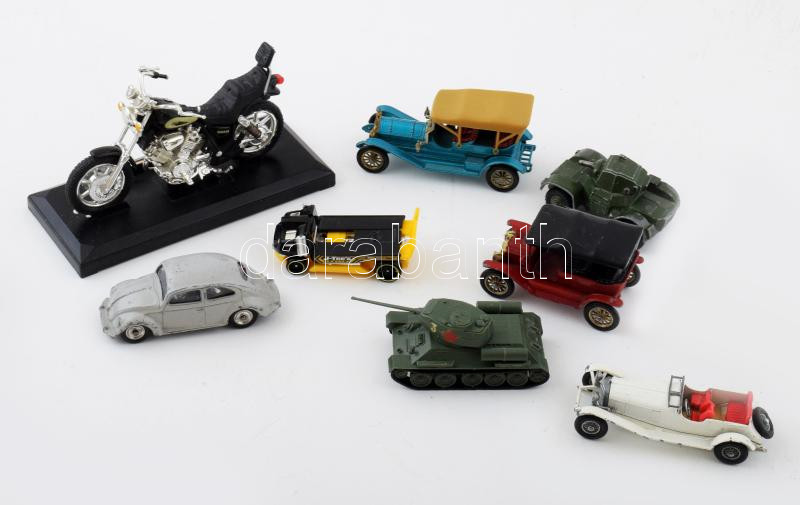 8 darab autó, tank és motor makett, közte 6 db angol gyártmányú fém da...