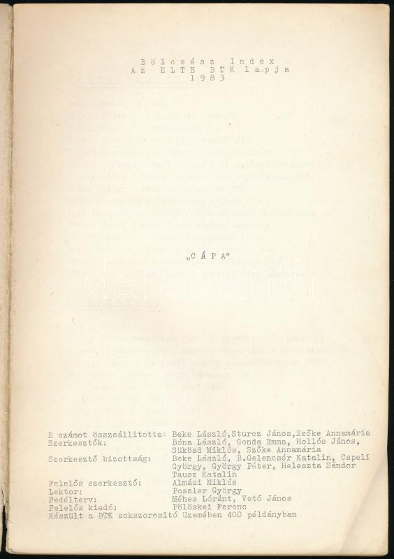 "CÁPA" Bölcsész Index. Az ELTE BTK lapja 1983. Összeáll.: Beke László, Sturcz János, Szőke Annamária. Bp., 1983, ELTE BTK-ny., 150 p. Kiadói papírkötés, kopott, szakadt borítóval. Megjelent 400 példányban.