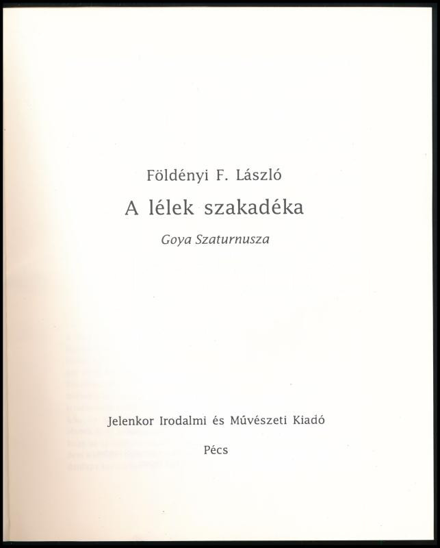 Földényi F. László: A lélek szakadéka. Goya Szaturnusza. Pécs, 1993, Jelenkor. 142 p. Kiadói papírkötés, kissé kopott gerinccel és borítóval.