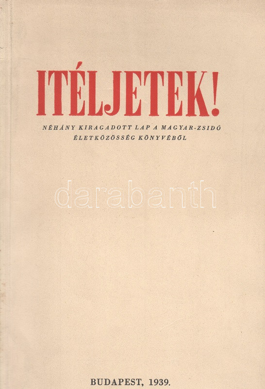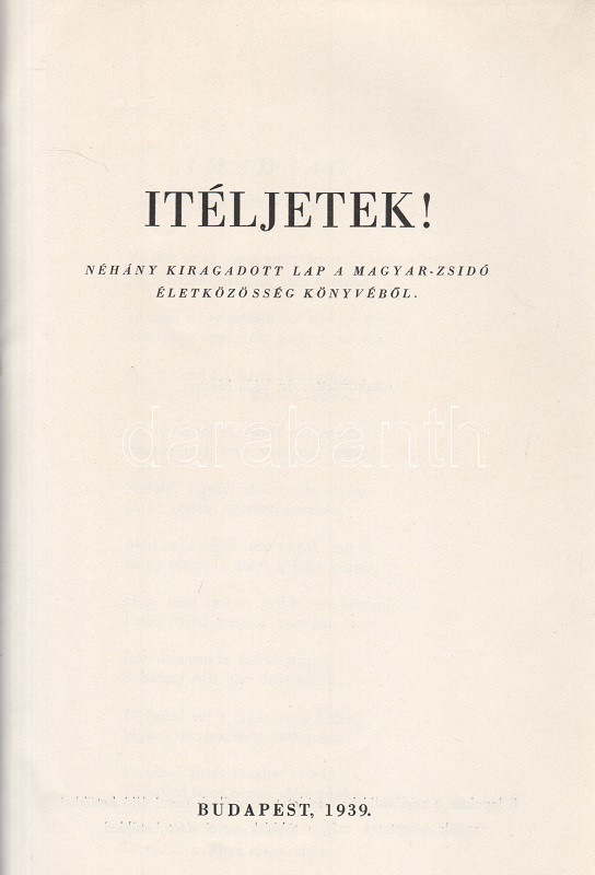 Ítéljetek! Néhány kiragadott lap a magyar-zsidó életközösség könyvéből. (Szerkesztette: Vida Márton.) Budapest, 1939. (Szerkesztő - Lőbl D. És Fia ny.) 62 + [2] p. Egyetlen kiadás. A zsidótörvények idején készült, oldalszámozáson belül számos egész oldalas és szövegközti fényképpel illusztrált kiadvány a magyarság politikai, kulturális céljaiban részt vállaló zsidó kiválóságok példájával érvel a zsidóság kirekesztése ellen. A kiadvány érdekes tipográfiai megoldása a munkában szereplő zsidó és magyar származású közéleti szereplők (költők, írók, szerkesztők, képzőművészek, zeneszerzők, színészek, vállalkozók, országgyűlési képviselők, MTA-tagok, háborús hősök, sportolók) neveinek eltérő szedése. Fűzve, enyhén sérült kiadói borítóban.