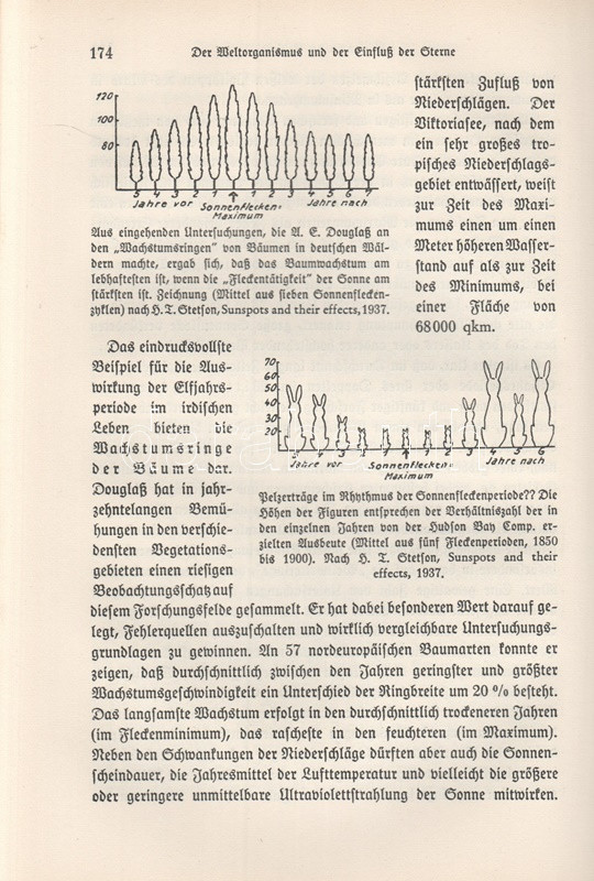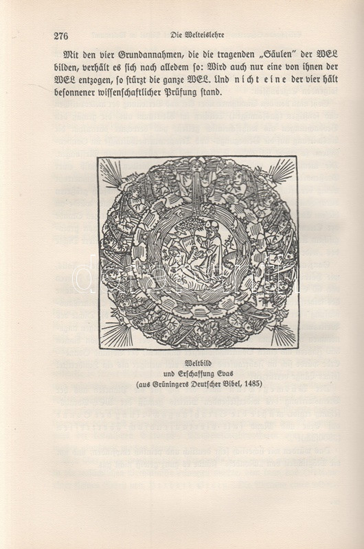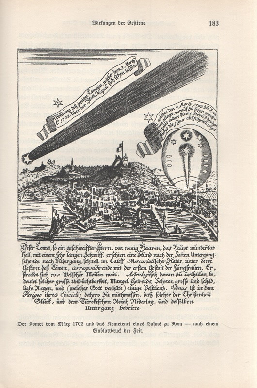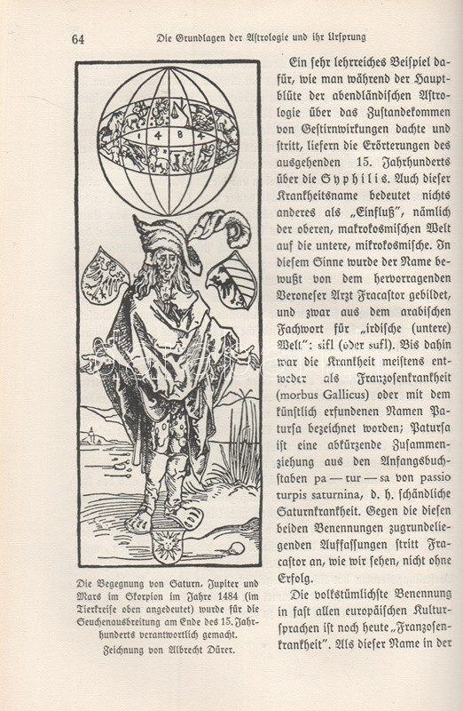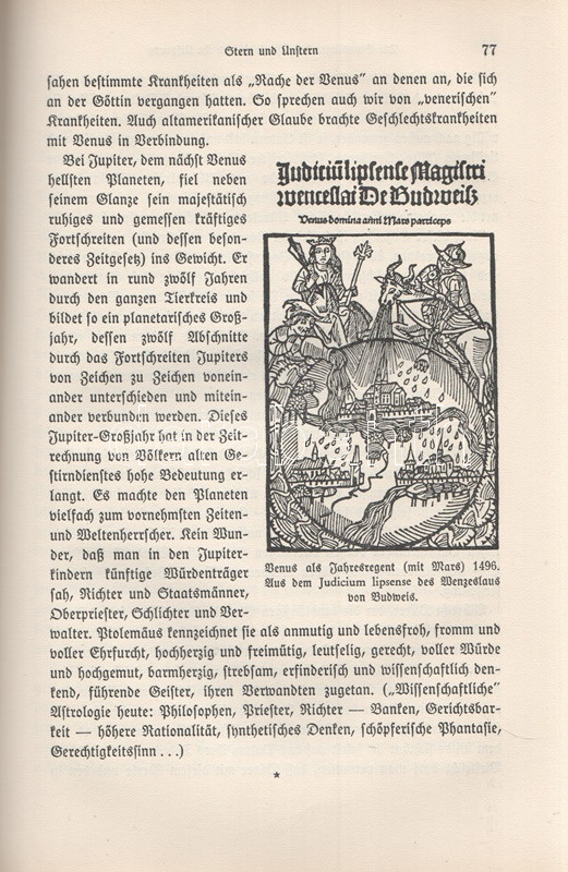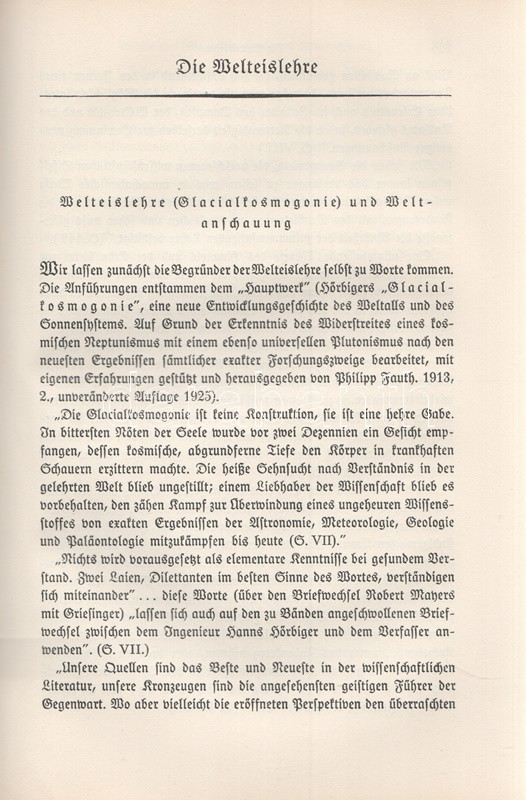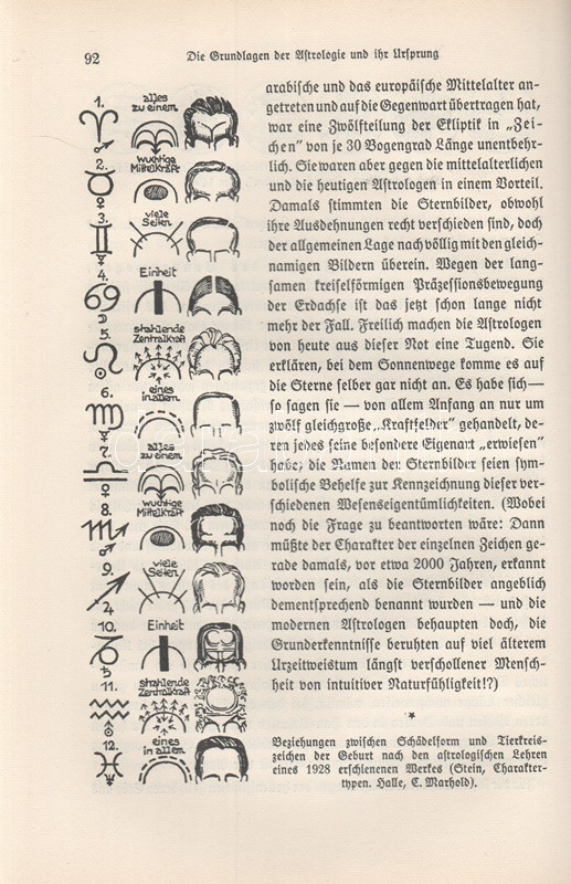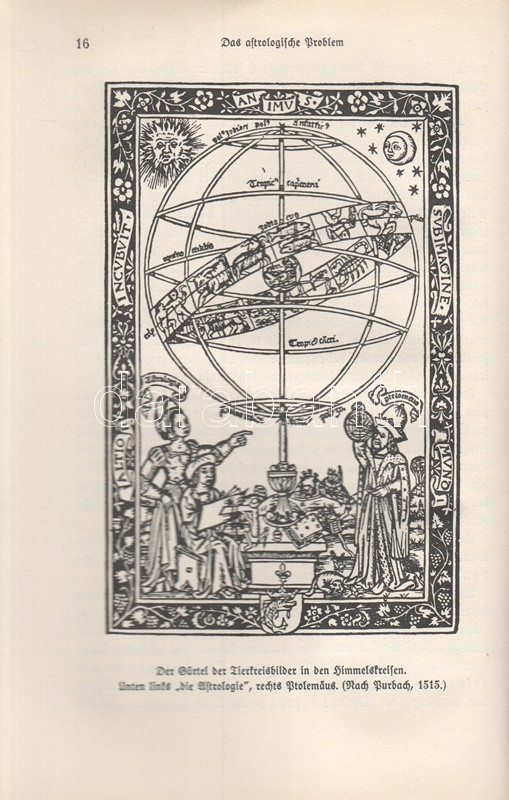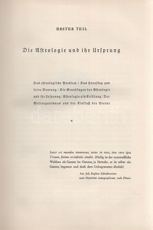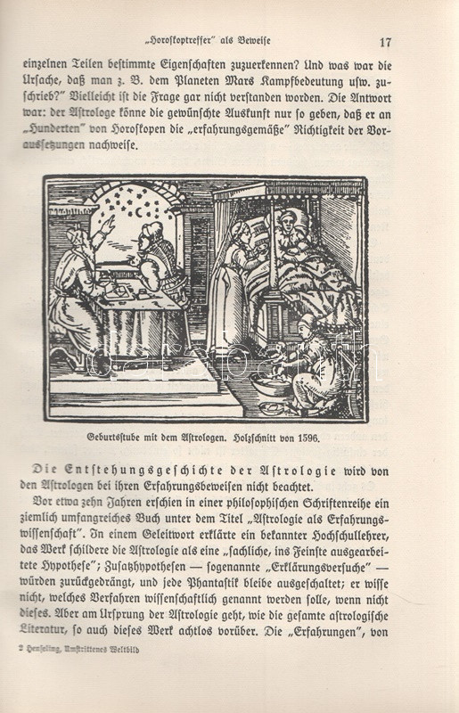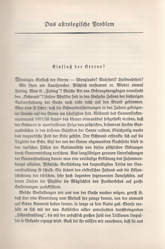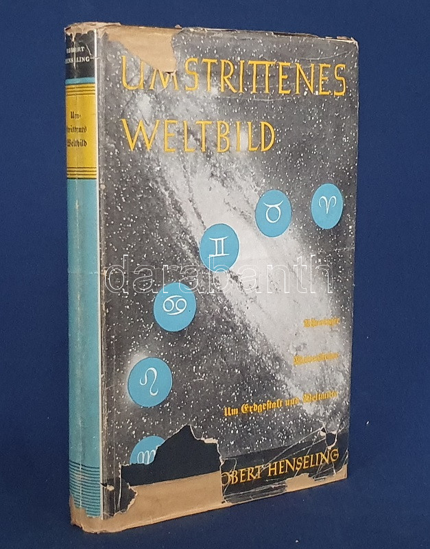 Henseling, Robert: Umstrittenes Weltbild. Astrologie. Welteislehre. Um Erdgestalt und Weltmitte. [Lipcse] Leipzig, 1939. Philipp Reclam Verlag (Reclam-Druck). 327 + [3] p. + 8 t. (kétoldalas). Első kiadás. Robert Henseling (1883-1964) német csillagász, csillagászati író, a Stuttgarti Obszervatórium és több csillagászati folyóirat alapítója, az amatőr csillagászat nemzetközileg is számottevő népszerűsítője. Unstrittenes Weltbild (Ellentmondásos világkép) címen kiadott, számos szövegközti illusztrációval kísért kultúrtörténeti összefoglalójában áttekinti az asztrológia és horoszkóp-készítés emlékezetes tudománytörténetét, a munka végén pedig vitába száll a nemzetiszocialisták által felkarolt ezoterikus csillagászati elmélettel, a világjég-elmélettel. Köteteit továbbra is kiadhatta, ám ismeretterjesztő előadások tartására ebben a Hitler-érában nem kapott engedélyt. Aranyozott kiadói egészvászon kötésben, színes, illusztrált, enyhén hiányos, verzóján javított kiadói védőborítóban. Jó példány.