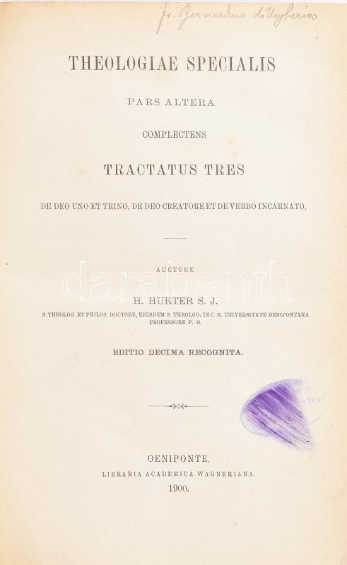H. Hurter S.J.: Theologiae specialis, pars altera, complectens tractatus tres de deo et uno et trino, de deo creatore et de verbo incarnato. Második kötet. Innsbruck, 1900, Academica Wagneriana. Latin nyelven. 10. átdolgozott kiadás. Átkötött aranyozott gerincű félbőr-kötésben, régi intézményi bélyegzőkkel, kissé kopott gerinccel és borítóval, néhány kevés lapon ceruzás jelölésekkel, néhány nagyon kevés lap kissé foltos. Csak a 2. kötet!