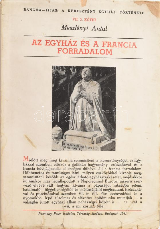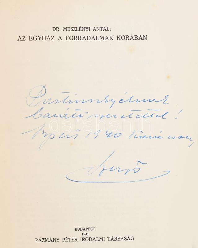Meszlényi Antal: Az egyház a forradalmak korában. A szerző, Meszlényi Antal (1894-1984) egyháztörténész, kanonok, az esztergomi főszékesegyházi káptalan nagyprépostja által DEDIKÁLT példány. A keresztény egyház története VII. 2. kötet. Bp.,1941, Pázmány Péter Irodalmi Társaság. Kiadói papírkötés, sérült, javított papír védőborítóban.