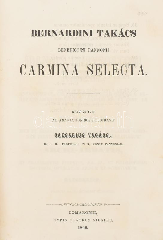Takács, Bernardini: Benedictini Pannonii carmina selecta. Recognovit ac adnotationibus illustravit Caesarius Vagács... Comaromii, 1866. Fratum Siegler. 290p. Korabeli aranyozott egészvászon kötésben, gerinc levált de a könyvben megvan Költeményeit, melyek közül több nyomtatásban is megjelent, Vagács Caesar gyűjtötte össze és adta ki ily czimmel: Bernardini Takács, benedictini Pannonii carmina selecta. Recognovit ac adnotationibus illustravit Caesarius Vagács... Comaromii, 1866. (,,Oly nagy benső hév árad el lyrai lelki szüleményein is, - mondja egyik bírálója, - minőt ritkán találunk lyrai költőnél, s mely az olvasót akaratlanul magával ragadja. ...Mennyire bírja a latin nyelv szellemét, s annak minden finom sajátságát! Kirí továbbá mindenütt nagy életbölcsessége, a vallásos érzelem kitünő foka." (M. Sion. 1886. 718. l.) Ritka!