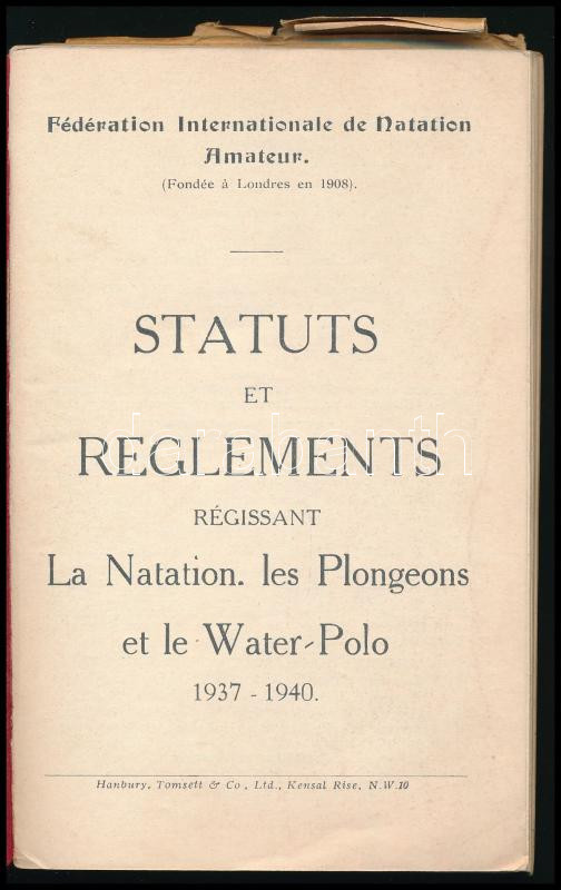 Fédération Internationale de Natation Amateur. Statuts et reglements régissant La Natation, les Plongeons et le Water-Polo 1937-1940. (London), é.n., Hanbury, Tomsett & Co., 165+(3) p.+ mellékletek. Francia nyelven. Kiadói papírkötés, sérült borítóval, a mellékletek kissé sérültek.