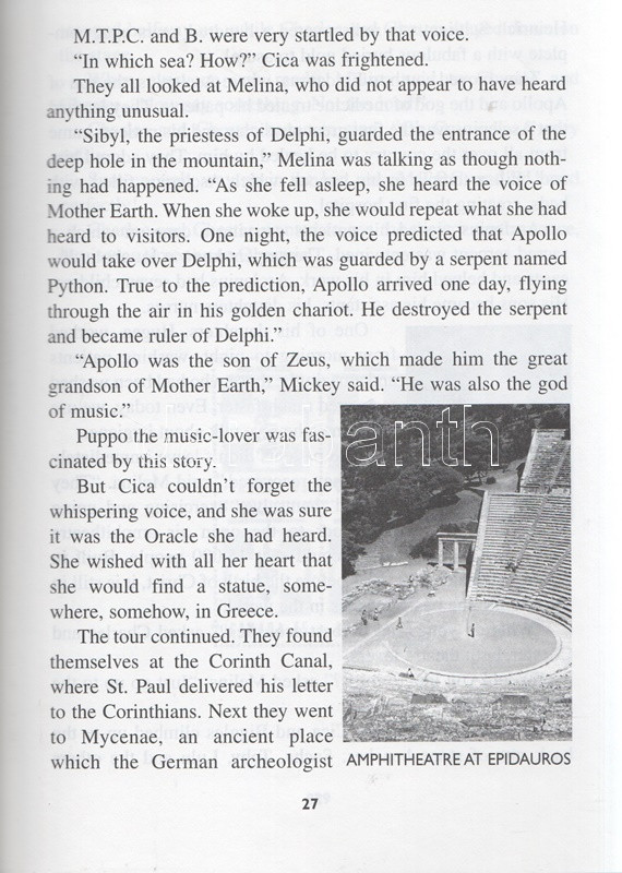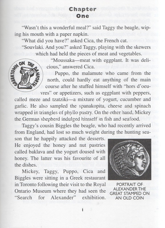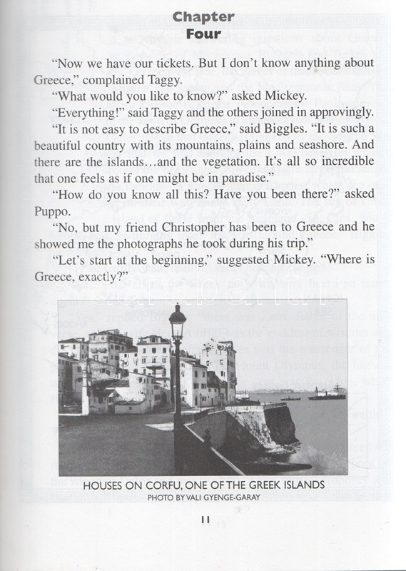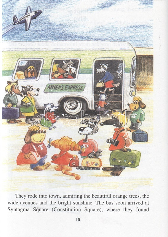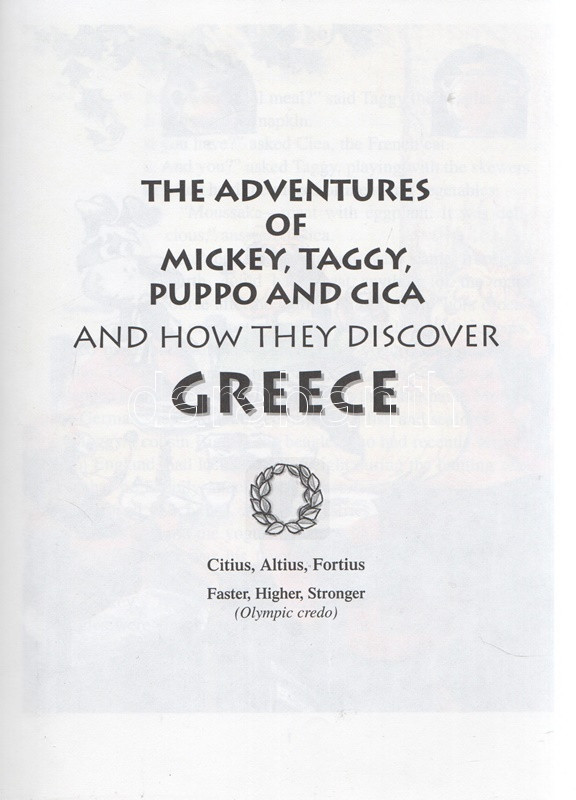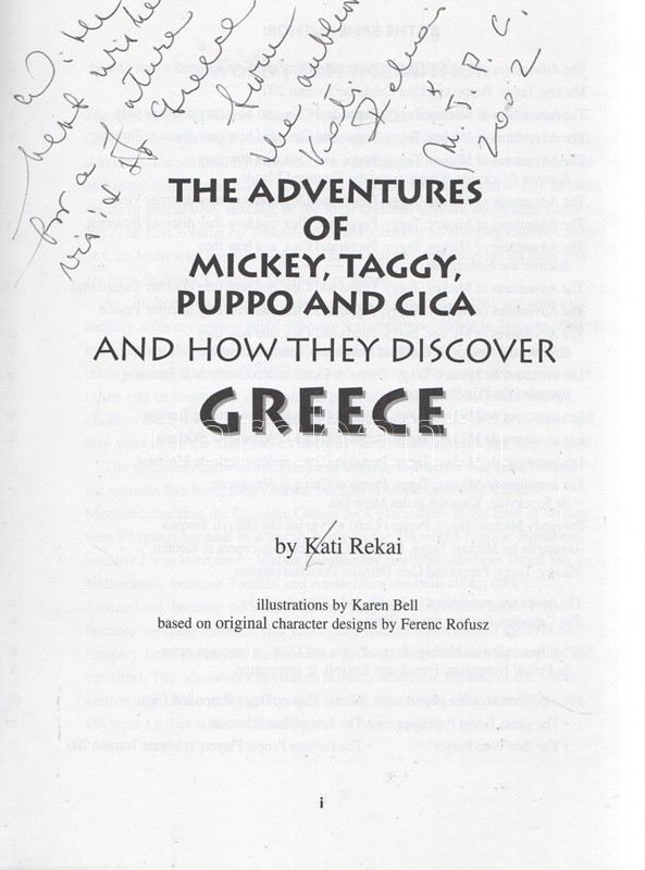 Rekai, Kati: The Adventures of Mickey, Taggy, Puppo and Cica and How They Discover Greece. Illustrations by Karen Bell. Based on original character designs by Ferenc Rofusz. (Dedikált.) Toronto, 1996. Canadian Stage and Arts Publications Ltd - Sigma Publishing & Rosehill Printing. VIII + [2] + 46 p. Dedikált: ,,With best wishes for a future visit to Greece, from the author, Kati Rekai & M. T. P. C. 2002". Rékai Kati (1921-2010) magyar származású kanadai írónő színes és egyszínnyomású rajzokkal gazdagon illusztrált ifjúsági ismeretterjesztő regénye. Az írónő már korábban is publikált gyerekeknek szánt, kalandos ifjúsági útikönyveket. A kötetben szereplő négy antropomorf állat mesehős az impresszum szerint Rofusz Ferenc animátor, Oscar-díjas rajzfilmrendező leleménye. Fűzve, színes, illusztrált kiadói borítóban. Jó példány.
