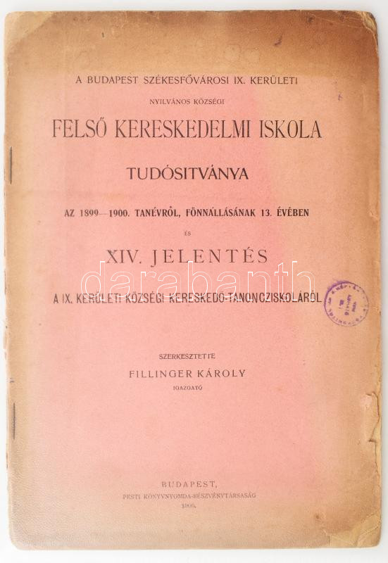 1900 A Budapest Székesfővárosi IX. Kerületi Nyilvános Községi Felső Kereskedelmi Iskola tudósítványa az 1899-1900. tanévről, fönnállásának 13. évében és XIV. jelentés a IX. kerületi községi kereskedő-tanoncziskoláról. Szerk.: Fillinger Károly. Bp., 1900, Pesti-Könyvnyomda-Rt., 79 p. Kiadói papírkötés, szakadt, foltos borítóval, bélyegzéssel.