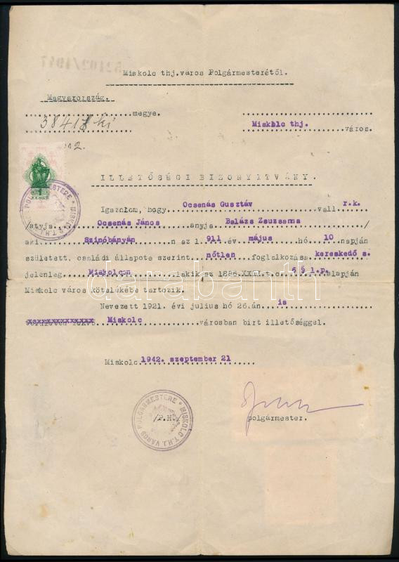 1942 Miskolc, illetőségi bizonyítvány városi illetékbélyegekkel