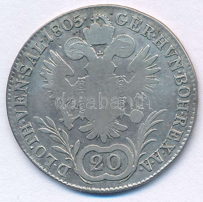 https://www.darabanth.com/en/472-Online-auction/472.0/Numismatics/Hungarian-coins-and-coins-with-Hungarian-mint-marks~2000009/1805B-20kr-Ag-I-Ferenc-TF-patina-Unger-III-1376a-Huszar-1967-Adamo-C29~II3194287