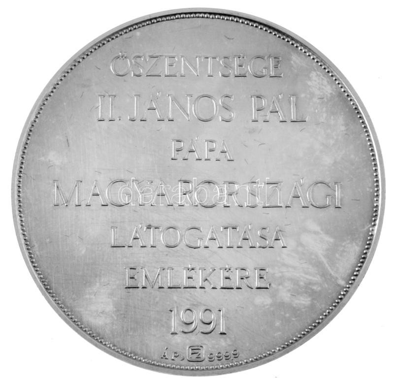 Description: Fülöp Zoltán (1951-2004) 1991. "Őszentsége II. János Pál pápa magyarországi látogatása emlékére 1991" kétoldalas jelzett Ag emlékérem műanyag tokban (15,72g/0.999/42,5mm) T:AU,XF felületi karcok (eredetileg PP)