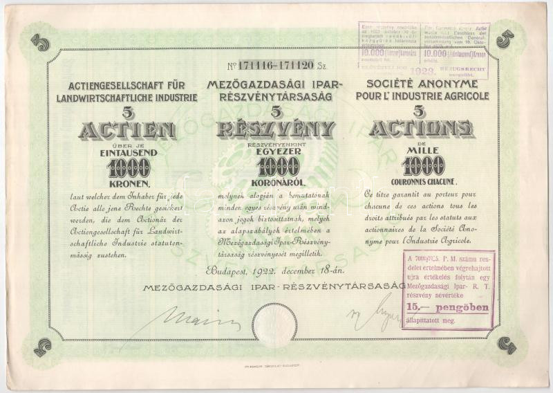 Budapest 1922. "Mezőgazdasági Ipar-Részvénytársaság" 5 részvénye 1000K-ról, három nyelven, szárazpecséttel, bélyegzéssel T:AU