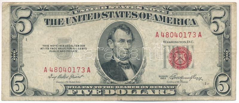 Amerikai Egyesült Államok 1953. 5$ piros pecsét, "Ivy Baker Pries... https://www.darabanth.com/en/472-Online-auction/472.0/Numismatics/Worldwide-banknotes~2000016/Amerikai-Egyesult-Allamok-1953-5USD-piros-pecset-Ivy-Baker-Priest-George-Magoffin-Humphrey-T~II3201163