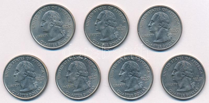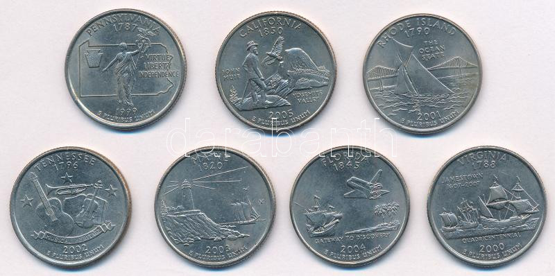 Amerikai Egyesült Államok 1999-2005. 25c Cu-Ni (7xklf) forgalmi emlékkiadások a "Szövetségi Államok" sorozatból, közte Pennsylvania, Virginia, Rhode Island, Tennessee, Maine, Florida, California T:AU,XF USA 1999-2005. 25 Cents Cu-Ni (7xdiff) circulating commemorative coins from the "50 State Quarters" series, in it Pennsylvania, Virginia, Rhode Island, Tennessee, Maine, Florida, California C:AU,XF
