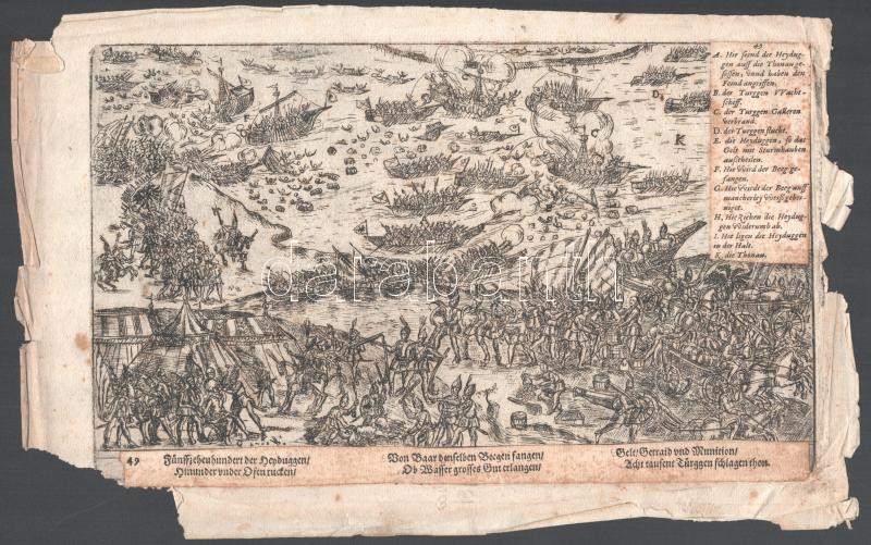 Portyázó hajdúk győzelme a törökön a Duna mellett 1599. Készítette J. Siebmacher. Hieronymus Ortelius: Chronologia oder Historische beschreibung aller Kriegs empörungen und belägerungen der Stätt und Vestungen . so in Ober und Under Ungern auch Siebenbürgen mit den Türcken c. munkájából. " Beszakadással.sarkán kis hiánnyal Rézmetszet , papír, 26x15,5 cm