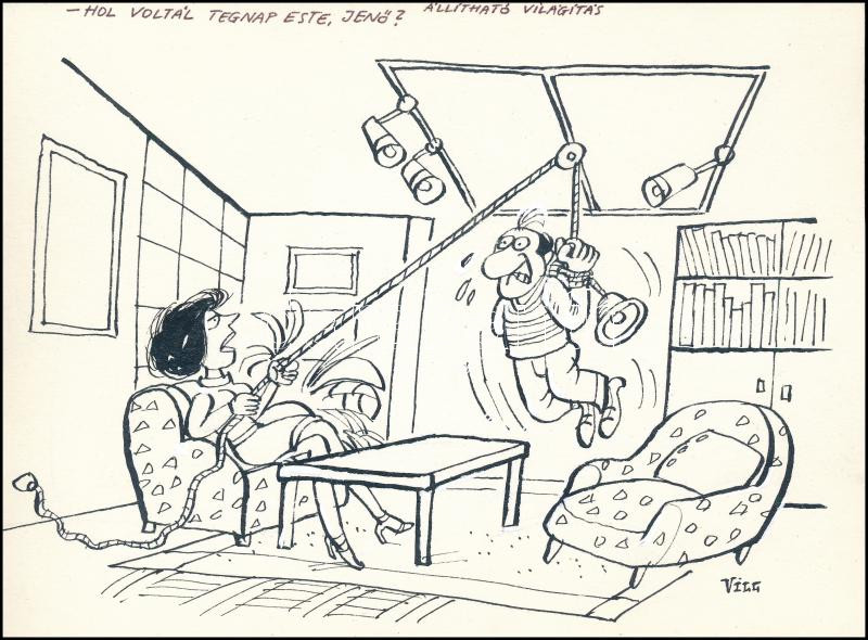 Földes Vilmos (1942-): Állítható világítás (karikatúra). Tus, fedőfehé...