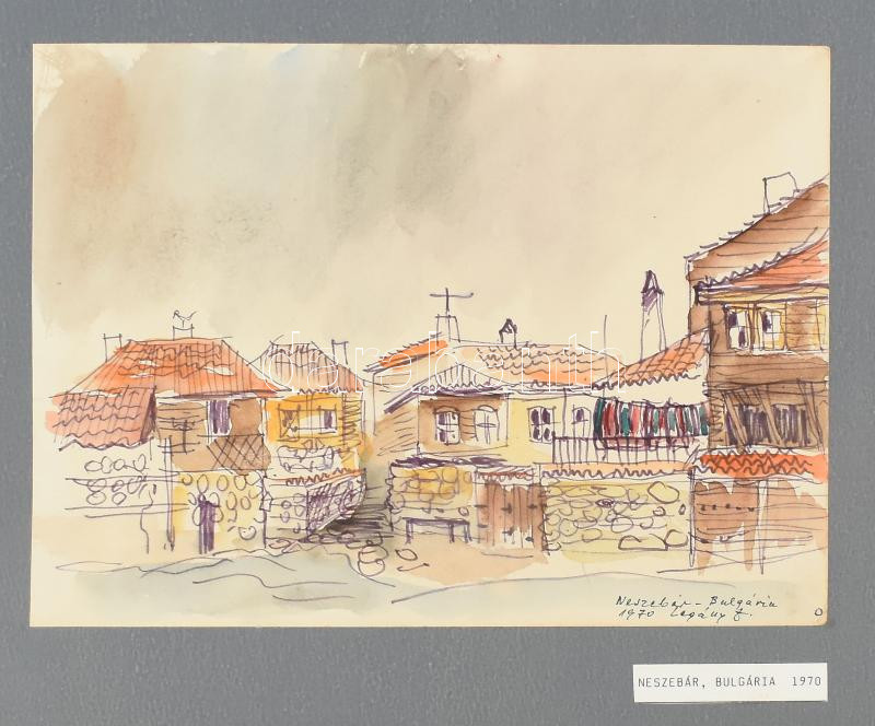 Legány Zoltán (1911-1993): Neszebár, Bulgária, 1970. Akvarell, filctoll, papír, jelzett, kartonra kasírozva. Feltehetően kiállítva: Magyar Építőművészek Szövetsége, egyéni gyűjteményes kiállítás, 1989. 19×26 cm / waterolour and felt pen on paper, signed, mounted on cardboard