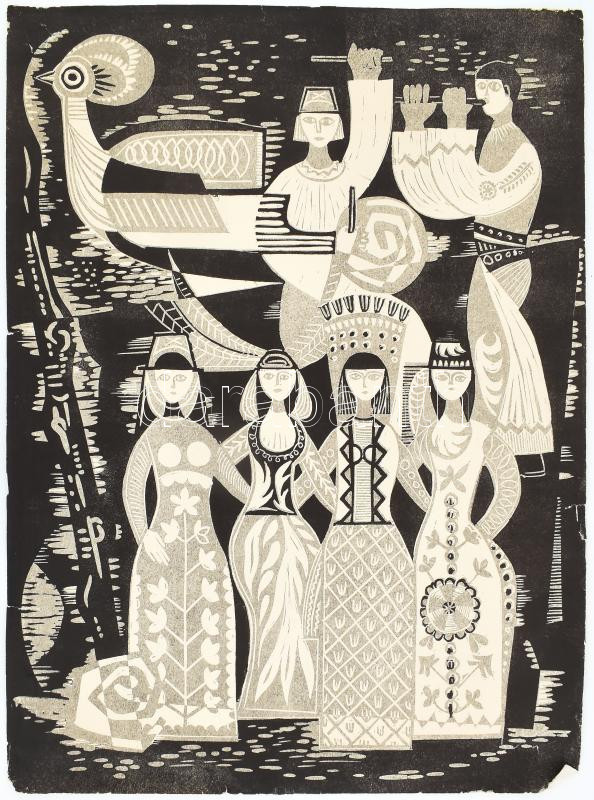 Takács Dezső (1933-): Leánybúcsú. Linómetszet, papír, jelzett a hátold...